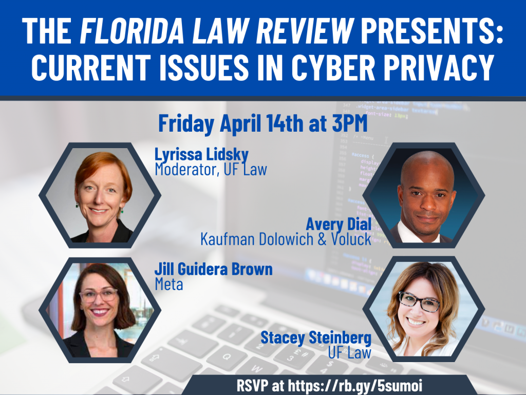 Please join the Florida Law Review and a panel of University of Florida Law alumni active in the cyber privacy field discuss the current legal framework of cyber privacy, preceding the 2023 Dunwody Distinguished Lecture. Lyrissa Barnett Lidsky, Raymond & Miriam Ehrlich Chair in U.S. Constitutional Law, UF Law, will moderate; Stacey Steinberg, Master Legal Skills Professor, UF Law; Avery Dial, Co-Chair of the Data Privacy and Cybersecurity Practice Group at Kaufman, Dolowich, Voluck; and Jill Brown, Associate General Counsel of Privacy, Meta; will present. Please RSVP here.