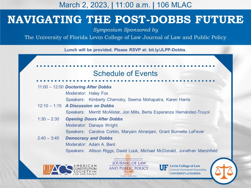 The University of Florida Journal of Law and Public Policy present their symposium, Navigating the Post-Dobbs Future. Please contact bent@law.ufl.edu for more information.