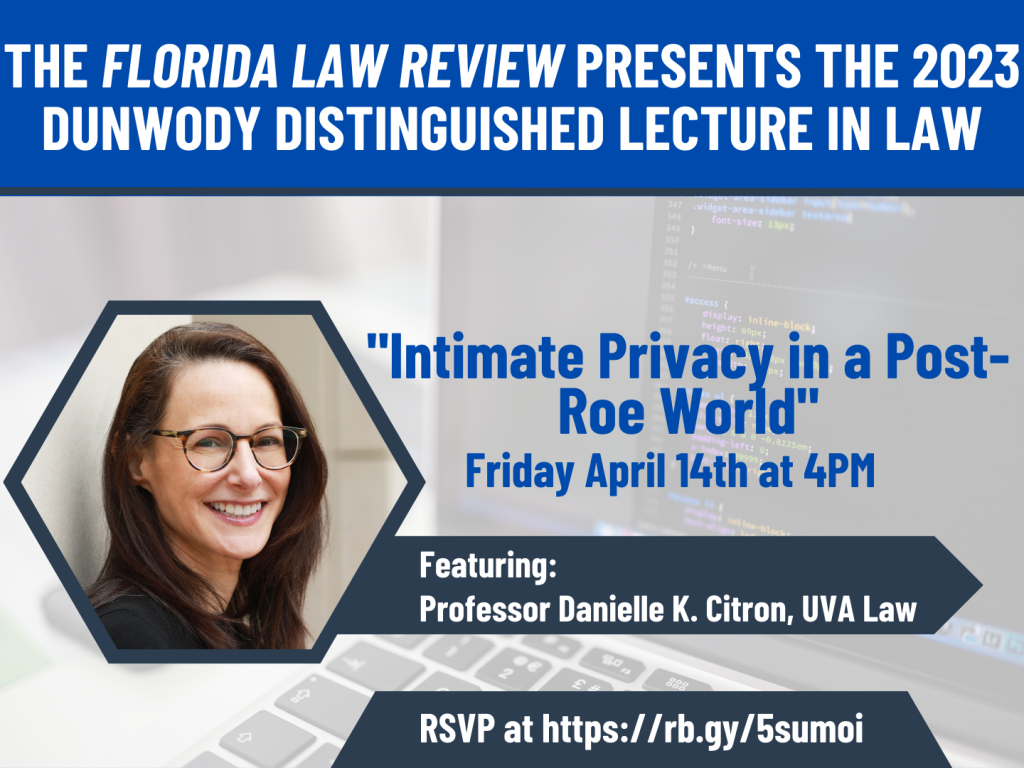 Please join the Florida Law Review for the 2023 Dunwody Distinguished Lecture in Law. Danielle K. Citron, Jefferson Scholars Foundation Schenck Distinguished Professor in Law, Caddell and Chapman Professor of Law, and Director, LawTech Center, University of Virginia School of Law, will present Intimate Privacy in a Post-Roe World. Please RSVP here.