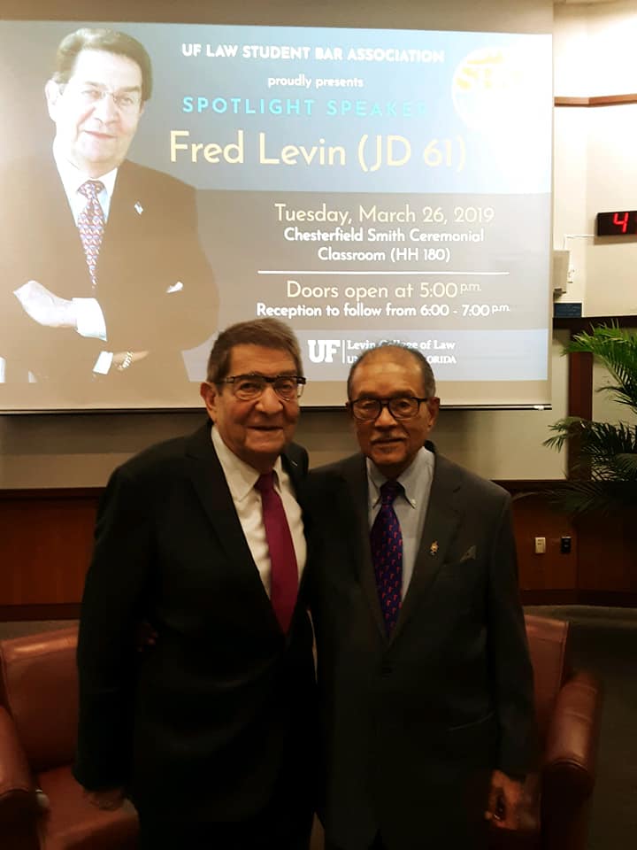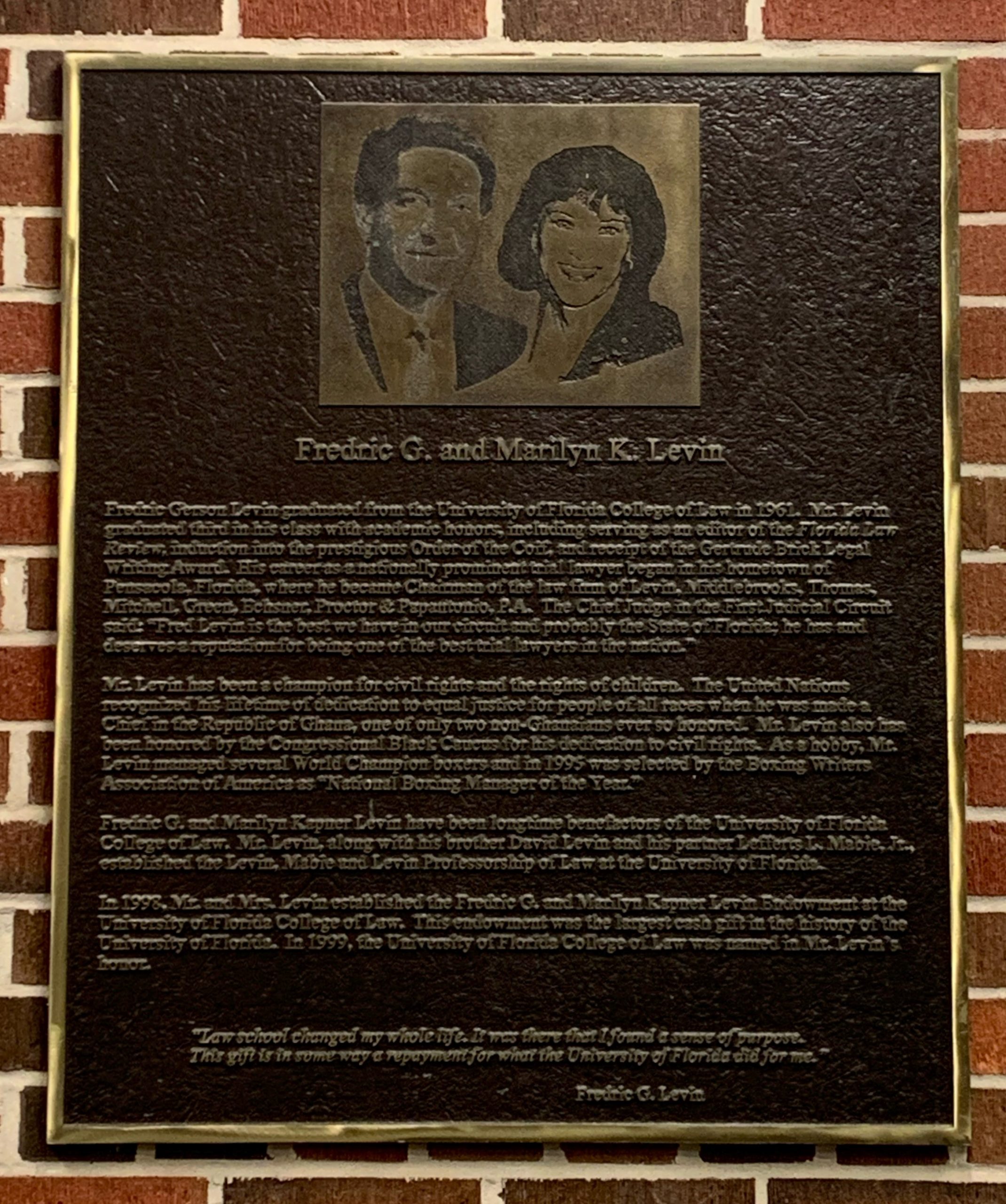 Fred’s incredible financial contributions to the College of Law, starting in 1999, have fueled our rise, supporting student scholarships, faculty recruitment, and the expansion of our campus.  We are forever indebted to Fred and his family and friends for their generosity.  Fred is survived by so many who have propelled the Levin College of Law forward, including close friend Phillip Morris, daughter Judge Marci Levin Goodman and son-in-law Judge Ross Goodman both from the UF Law Class of 1985, son Martin Levin from the UF Law Class of 1988, grandson Brenton Goodman from the UF Law Class of 2016, and sister-in-law Teri Levin, who was married to Fred’s brother Allen Levin.