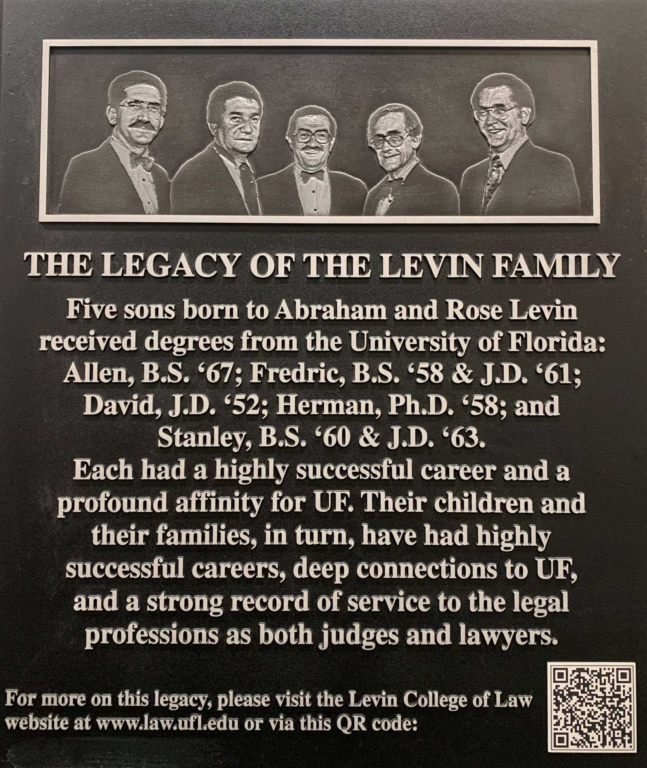 These plaques honoring the legacy of the Levin family are on display in the Martin H. Levin Advocacy Center and in Holland Hall on the UF Levin College of Law campus.