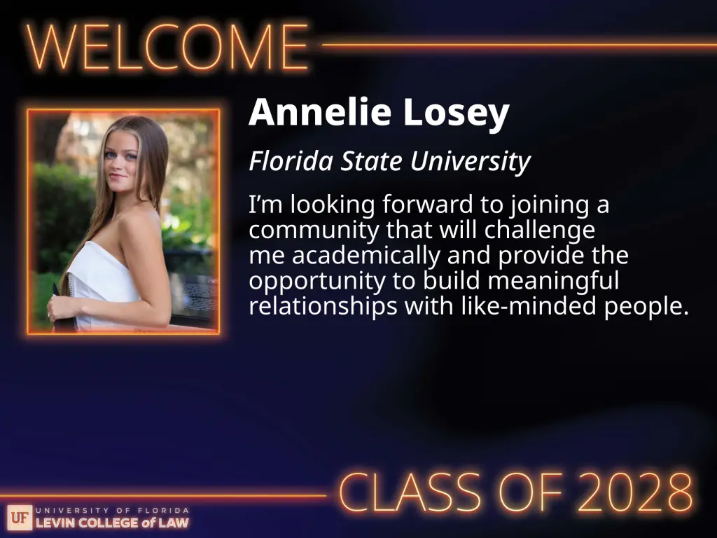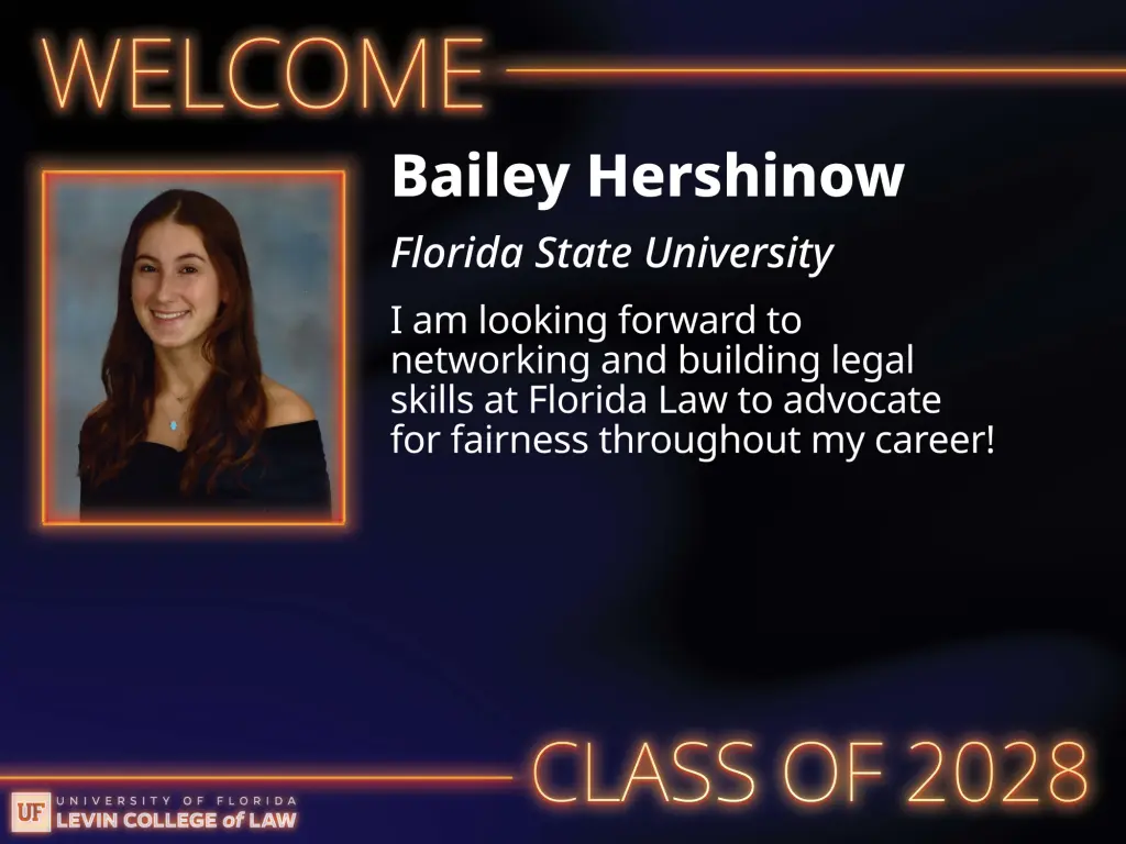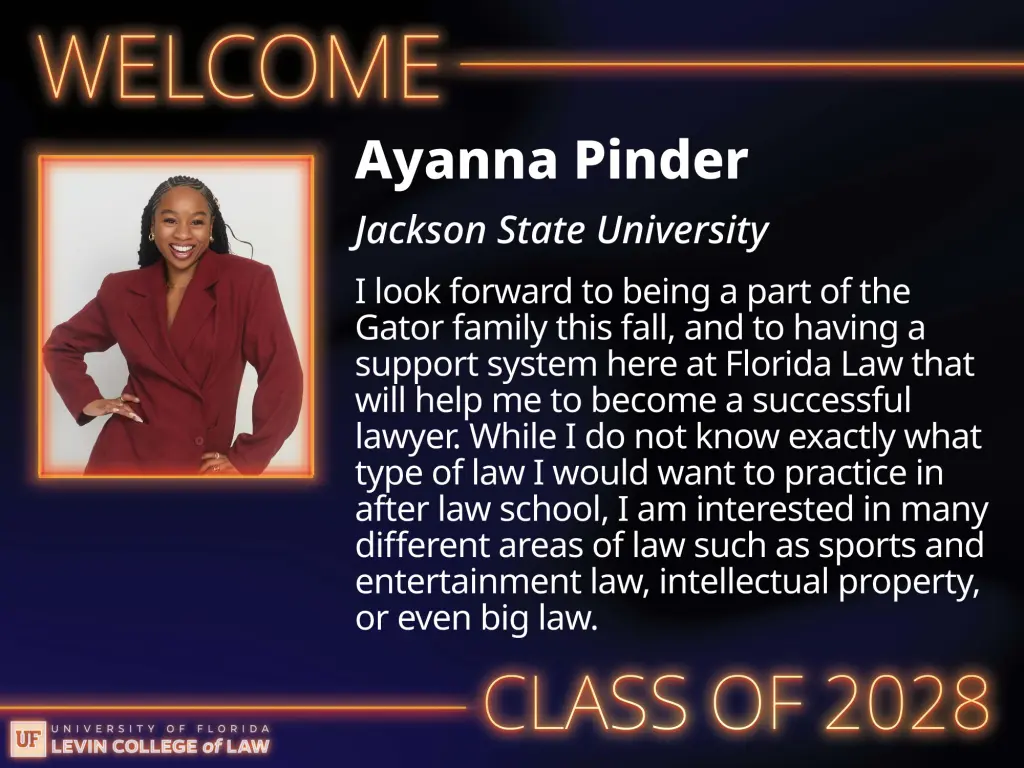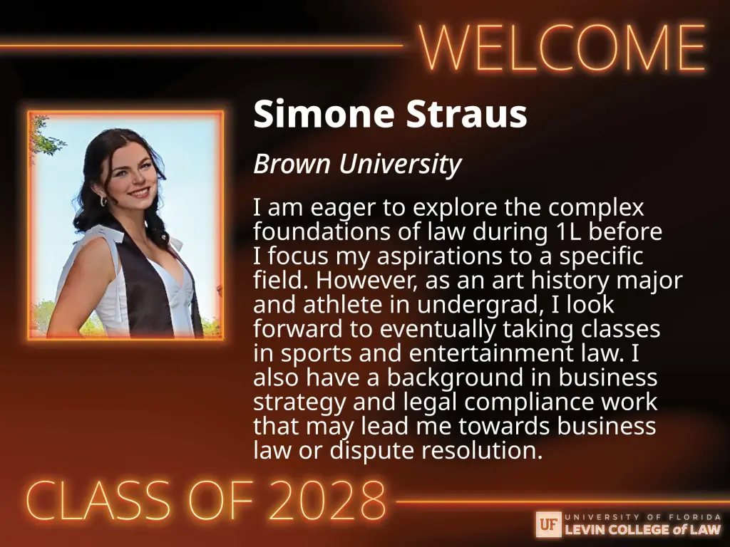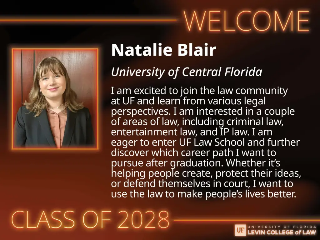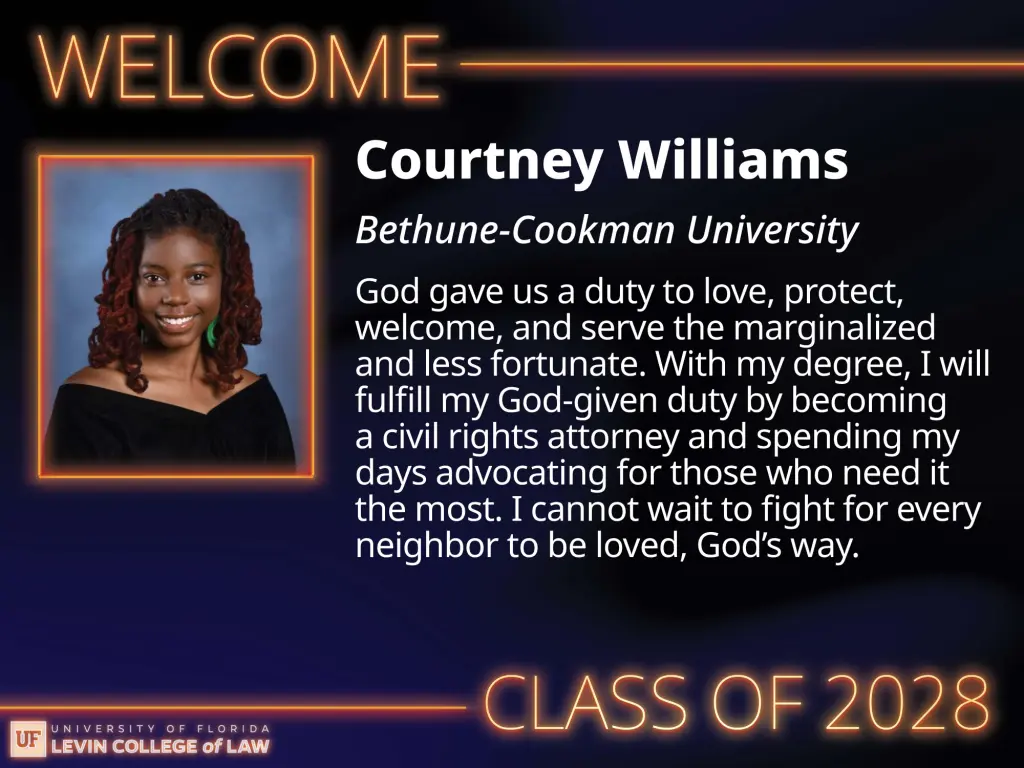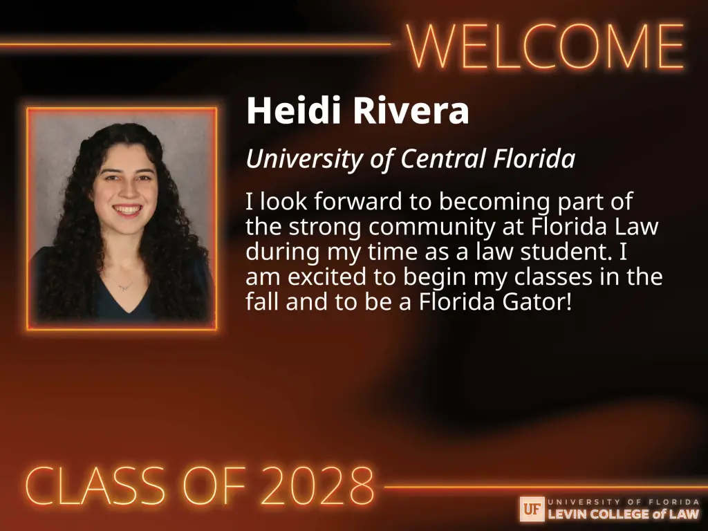 Leslie Green stands behind an oak podium at the front of a lecture hall. She is smiling and wearing a black suit blazer with a white shirt. Behind her is oak paneling toward the floor, and then a row of giant white boards. To her right is a long table with a black tablecloth over it. There are no one in the seats and on top of the black table cloth is a smaller blue table cloth with the UF Levin College of Law logo. In the foreground, students face the front as they listen to Leslie speak. They are slightly blurred. The focus is on Leslie, who is speaking.