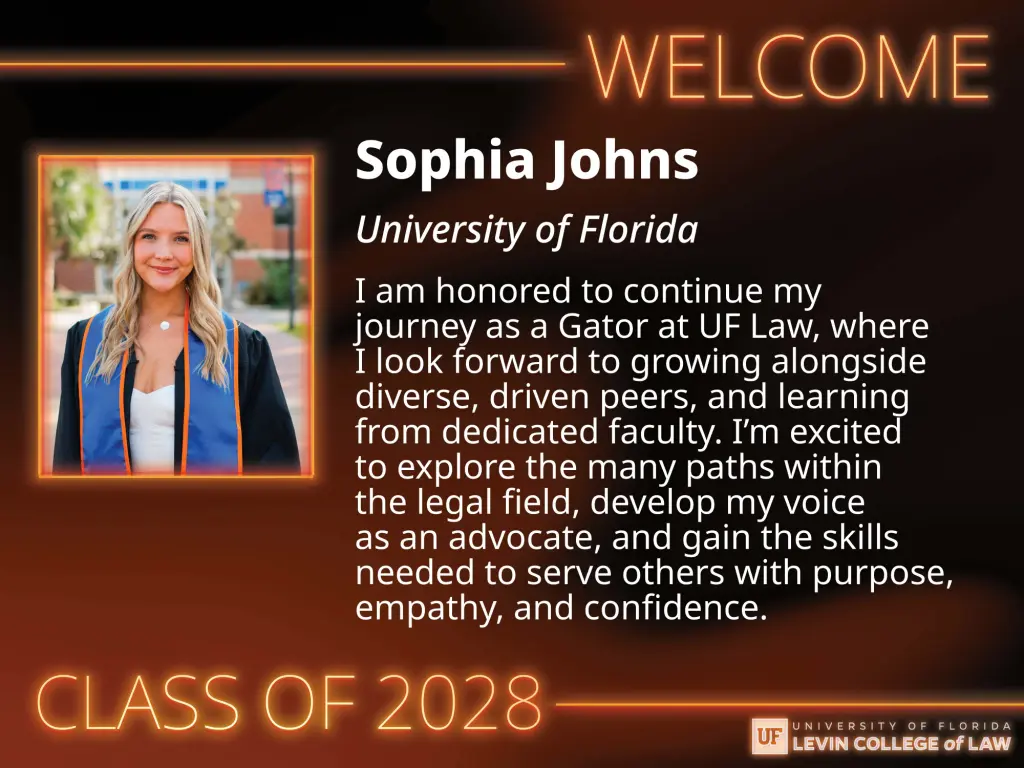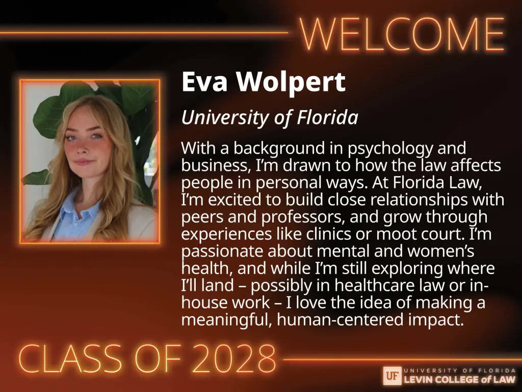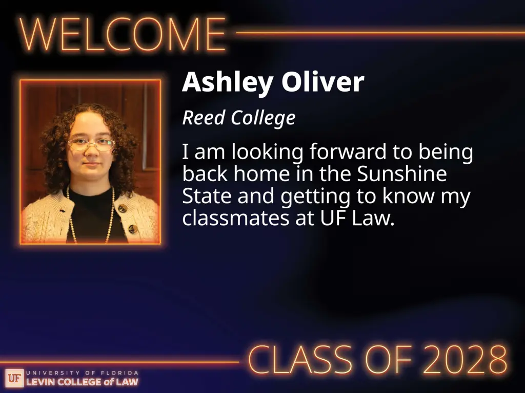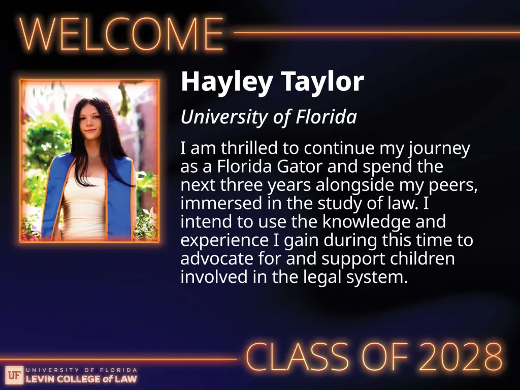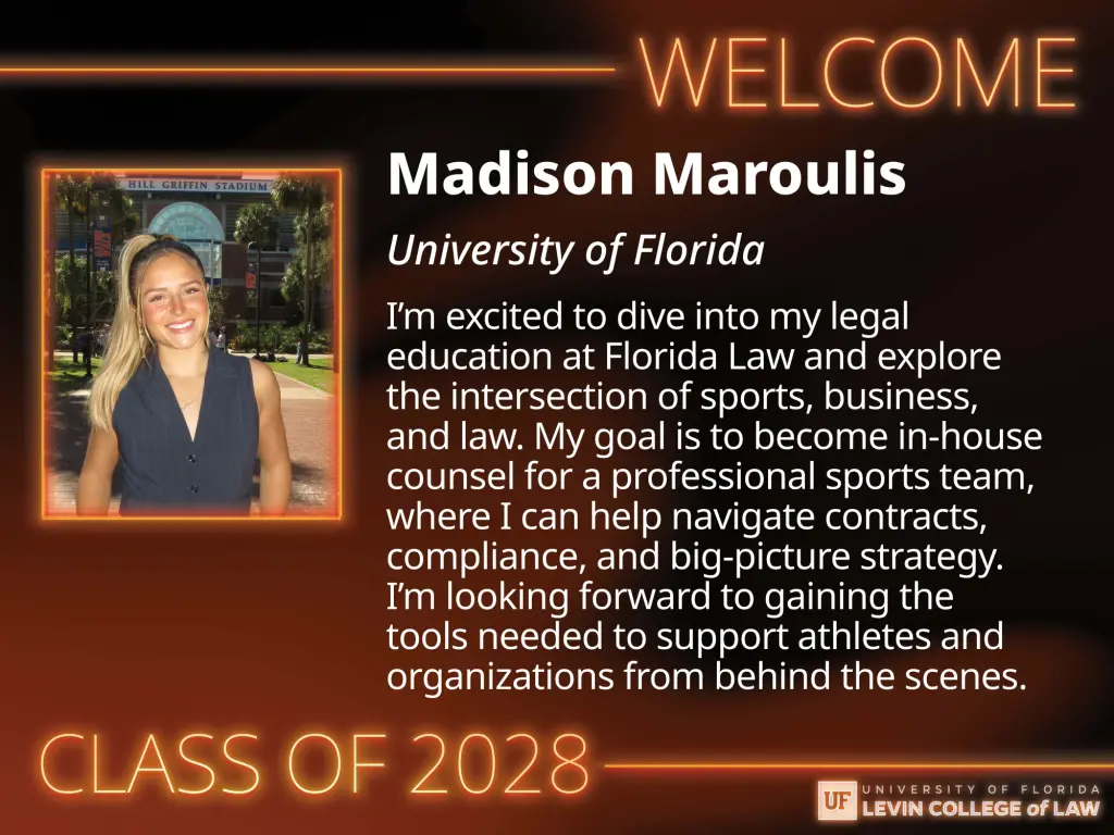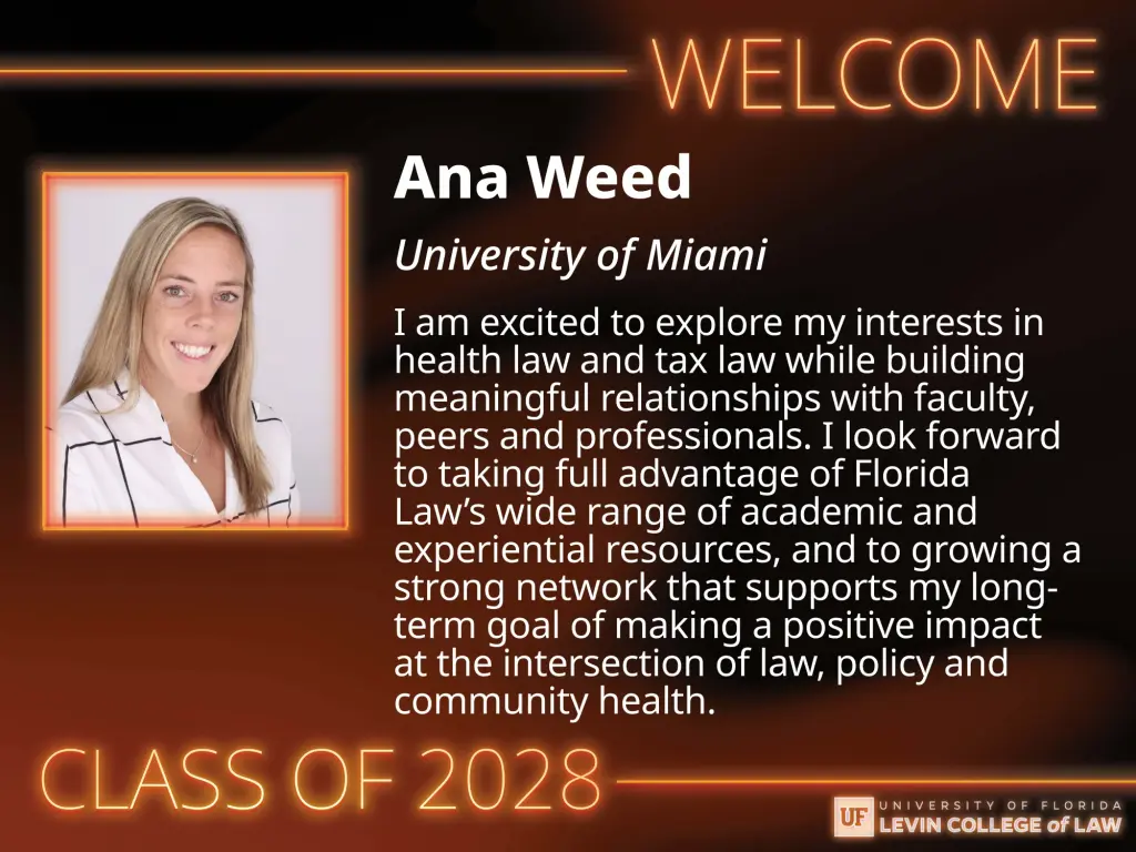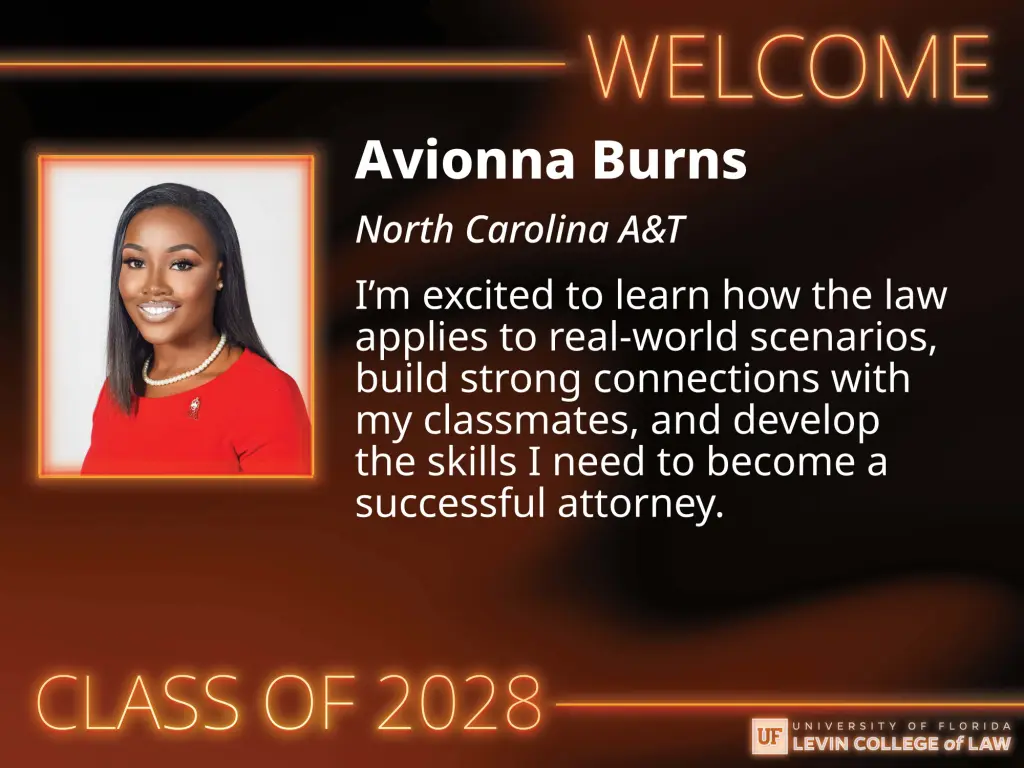 Leslie Green stands behind an oak podium at the front of a lecture hall. She is smiling and wearing a black suit blazer with a white shirt. Behind her is oak paneling toward the floor, and then a row of giant white boards. To her right is a long table with a black tablecloth over it. There are no one in the seats and on top of the black table cloth is a smaller blue table cloth with the UF Levin College of Law logo. In the foreground, students face the front as they listen to Leslie speak. They are slightly blurred. The focus is on Leslie, who is speaking.