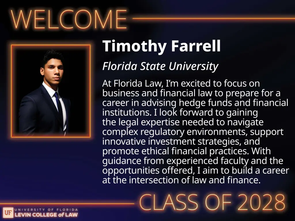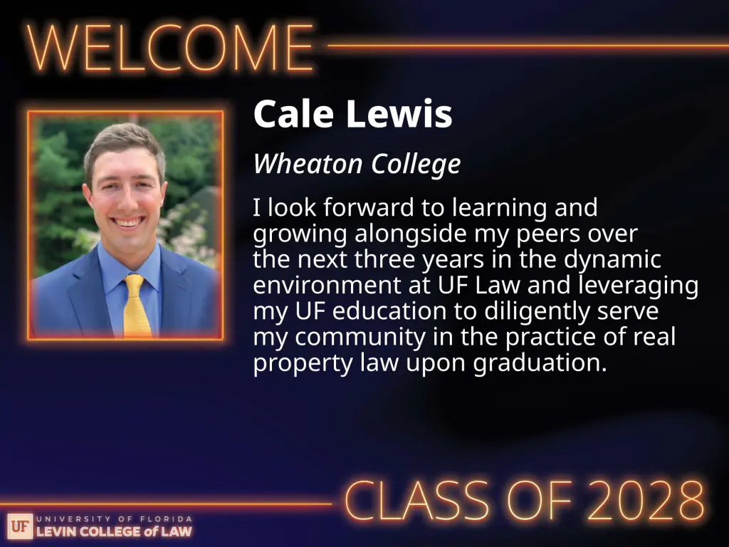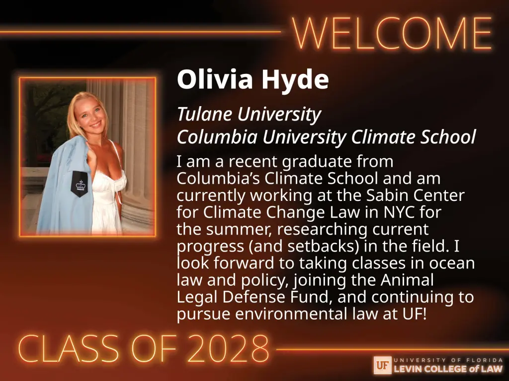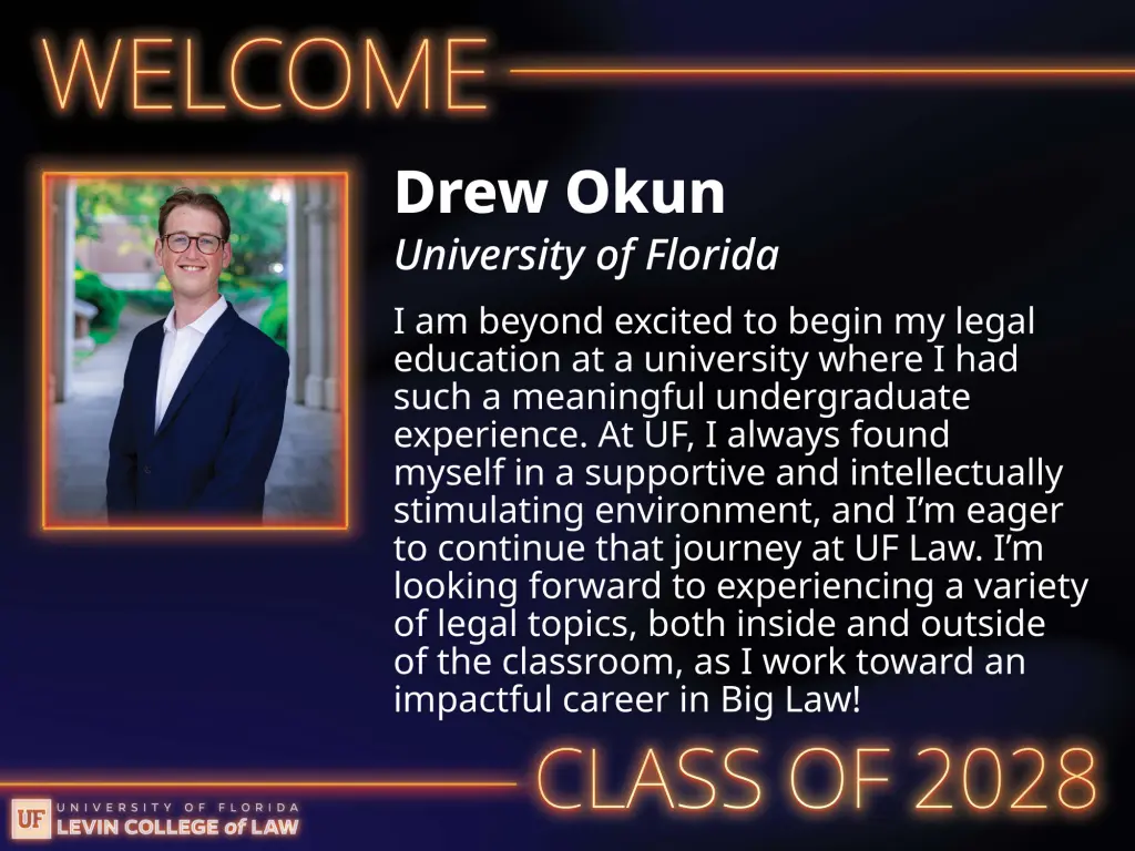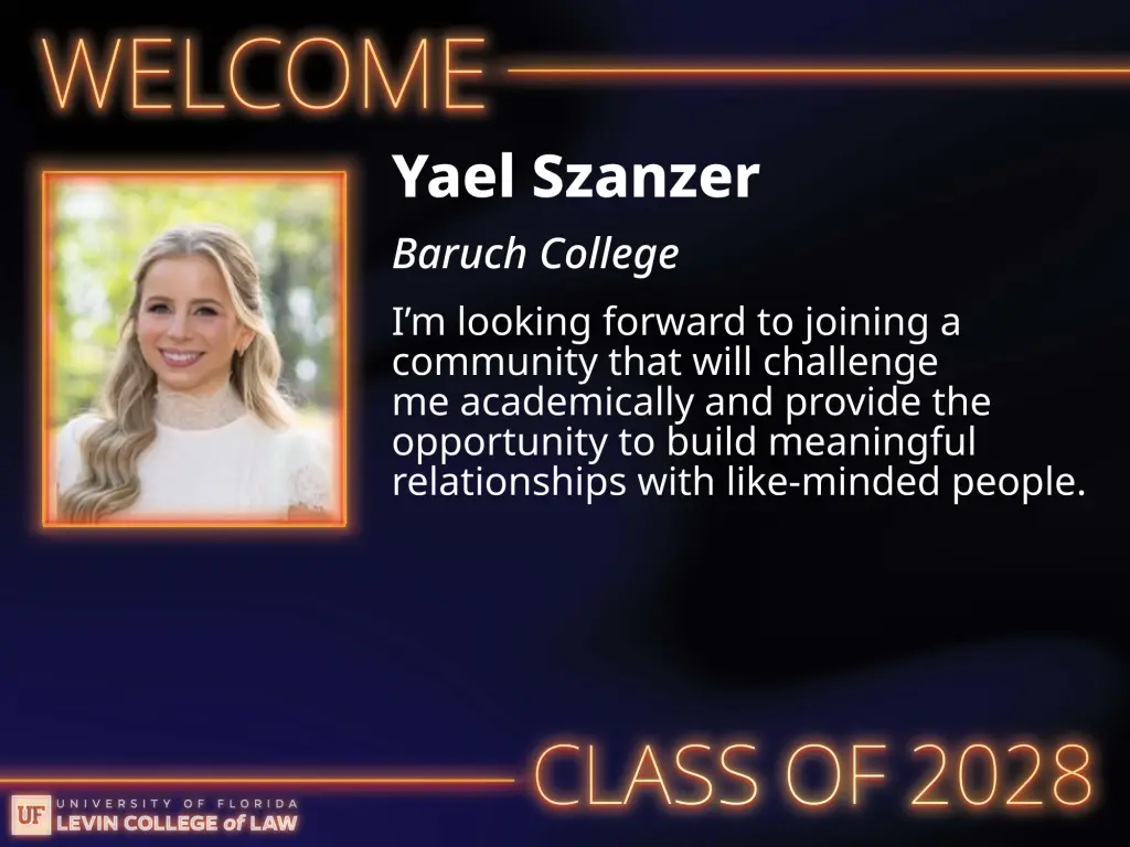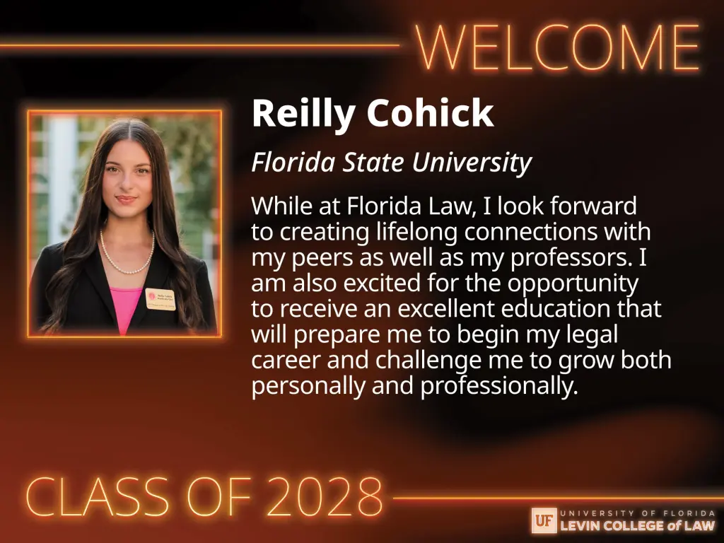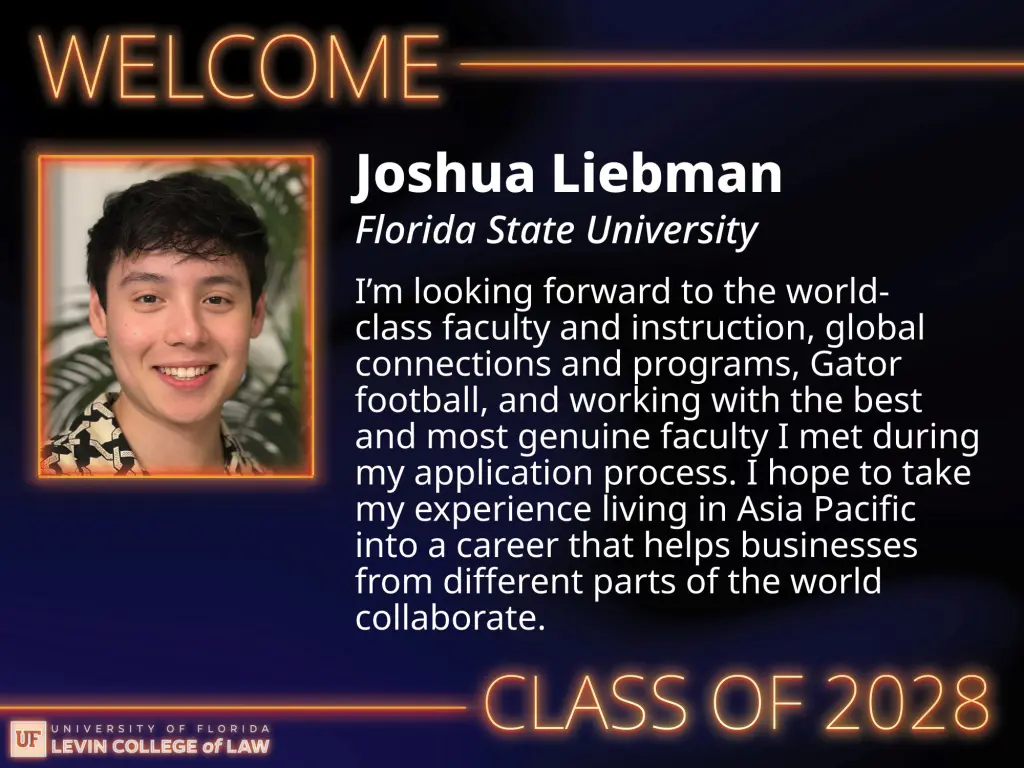 Leslie Green stands behind an oak podium at the front of a lecture hall. She is smiling and wearing a black suit blazer with a white shirt. Behind her is oak paneling toward the floor, and then a row of giant white boards. To her right is a long table with a black tablecloth over it. There are no one in the seats and on top of the black table cloth is a smaller blue table cloth with the UF Levin College of Law logo. In the foreground, students face the front as they listen to Leslie speak. They are slightly blurred. The focus is on Leslie, who is speaking.
