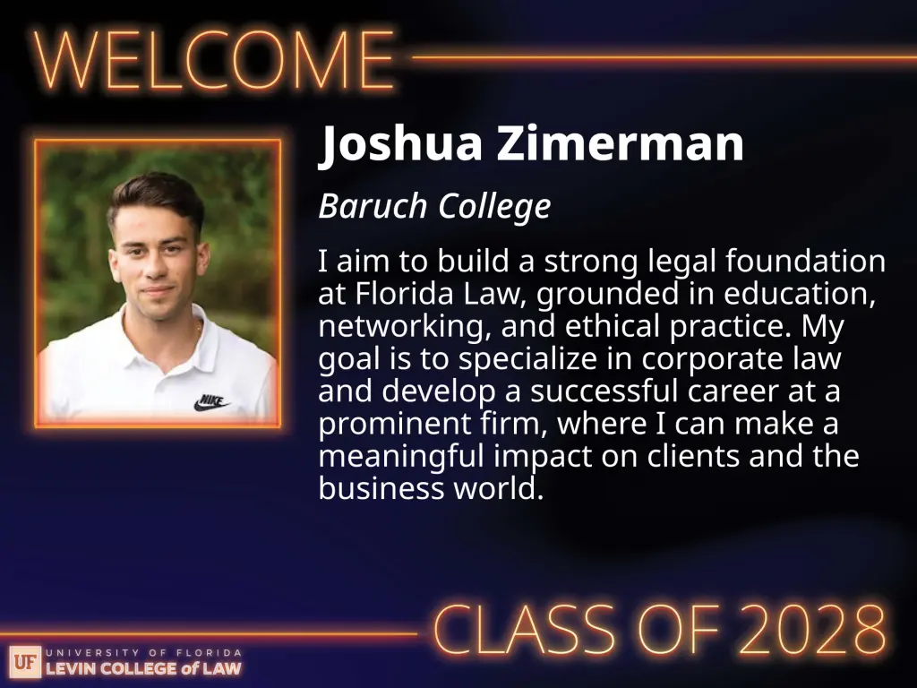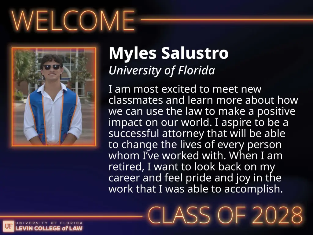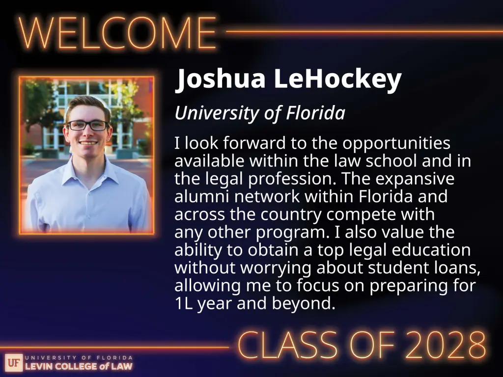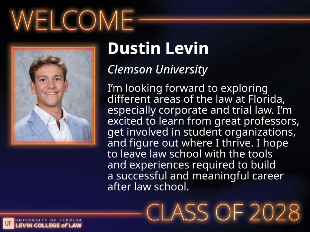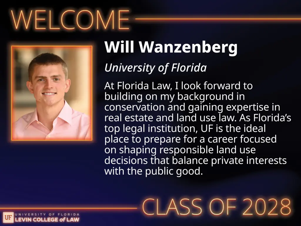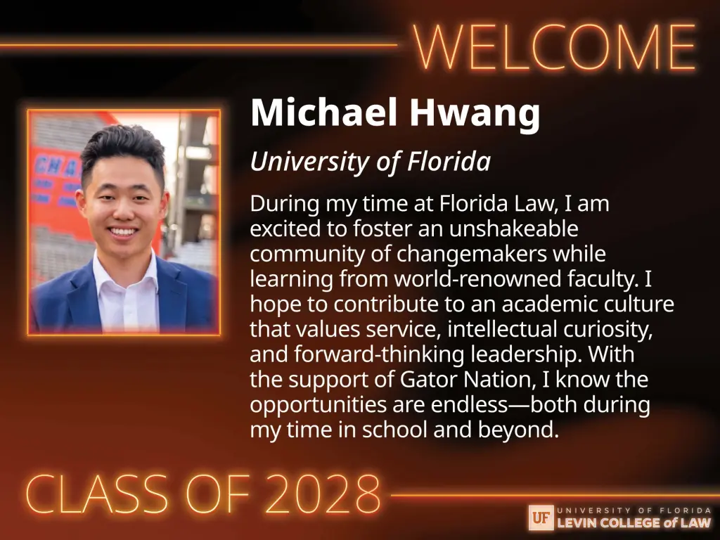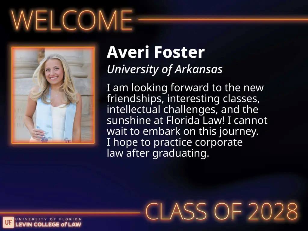 Leslie Green stands behind an oak podium at the front of a lecture hall. She is smiling and wearing a black suit blazer with a white shirt. Behind her is oak paneling toward the floor, and then a row of giant white boards. To her right is a long table with a black tablecloth over it. There are no one in the seats and on top of the black table cloth is a smaller blue table cloth with the UF Levin College of Law logo. In the foreground, students face the front as they listen to Leslie speak. They are slightly blurred. The focus is on Leslie, who is speaking.