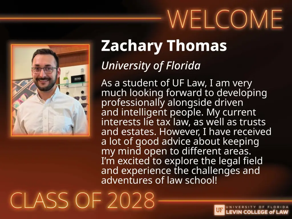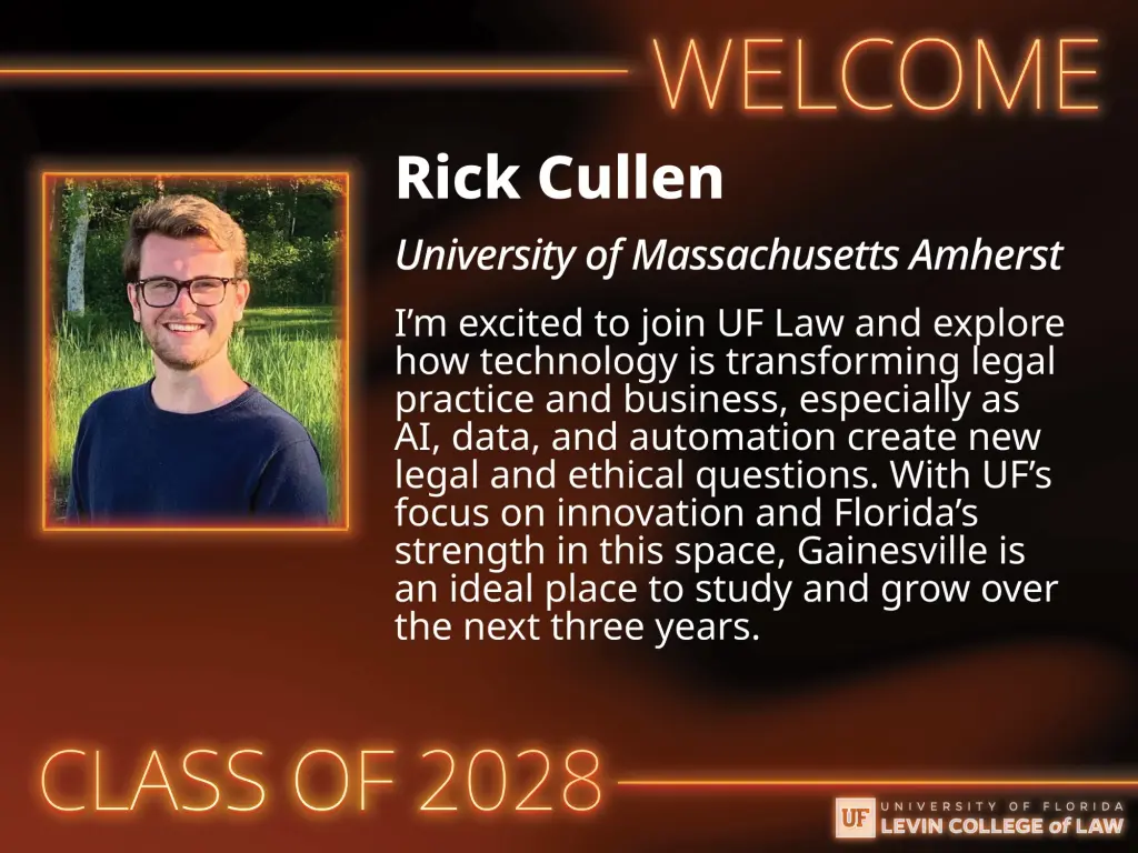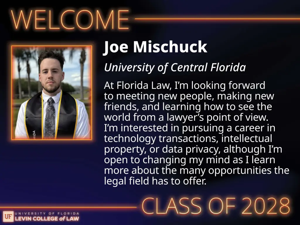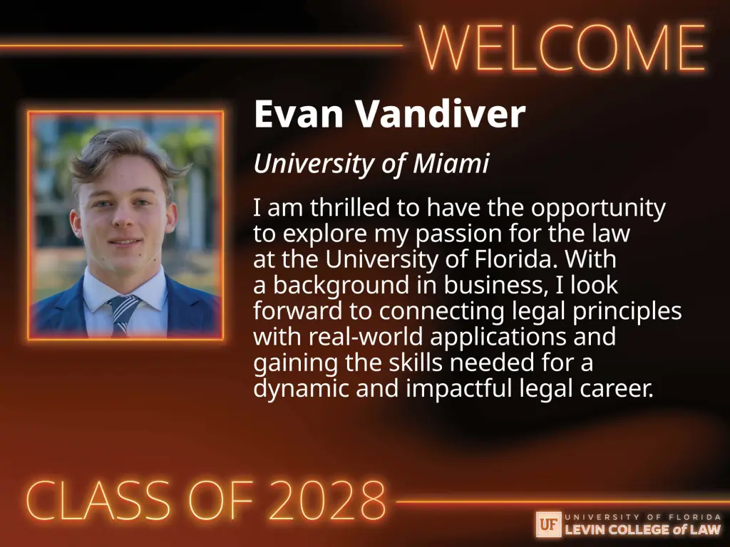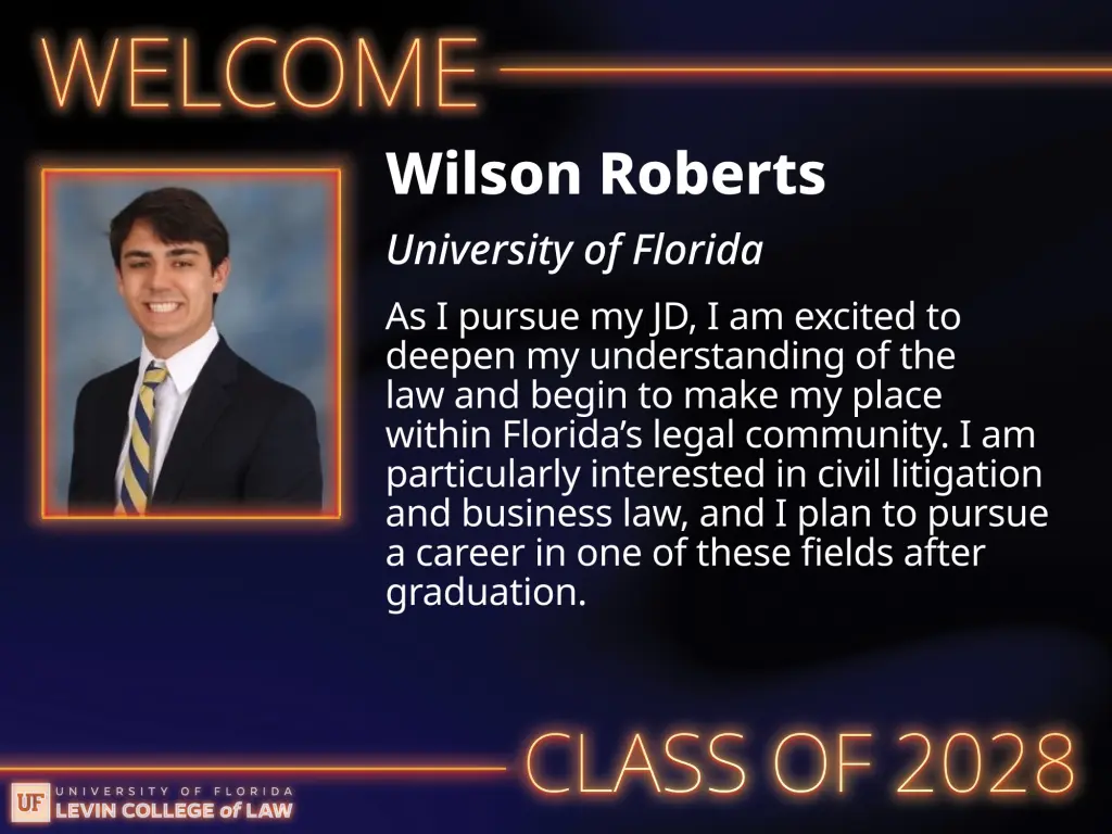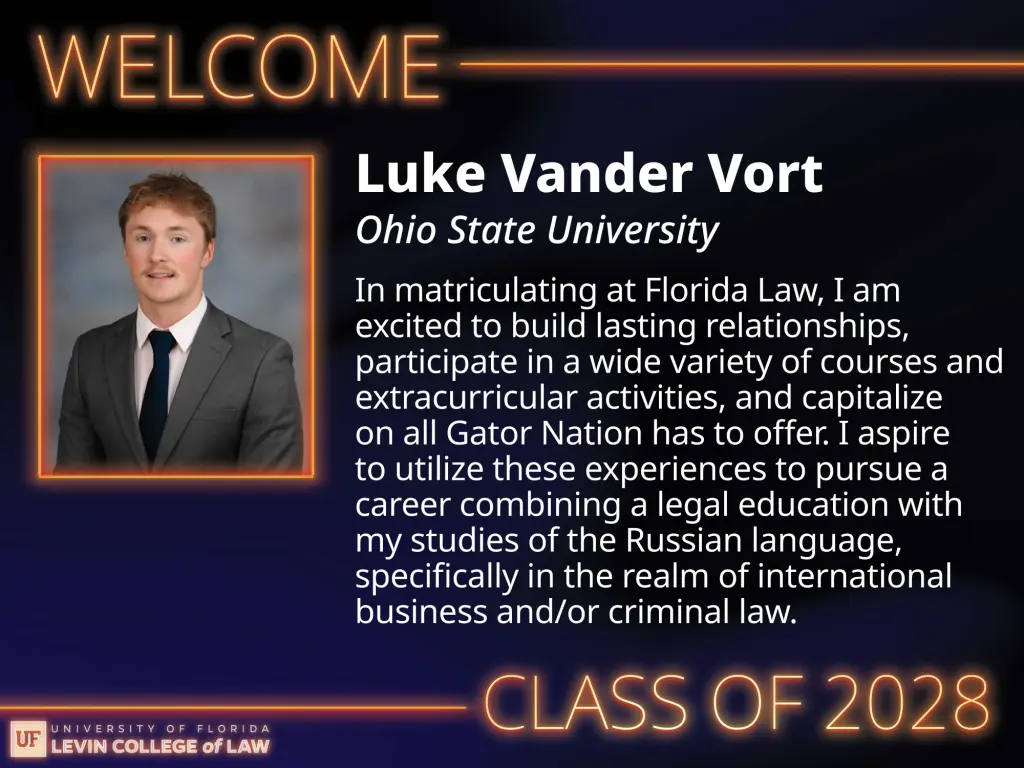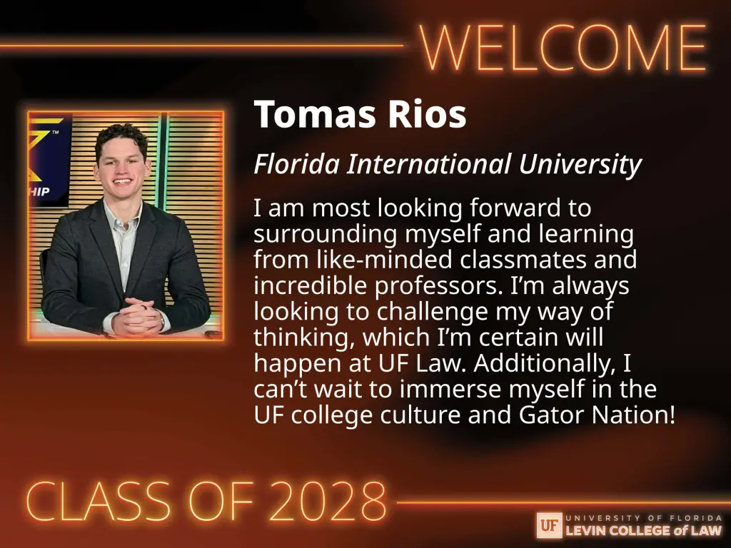 Leslie Green stands behind an oak podium at the front of a lecture hall. She is smiling and wearing a black suit blazer with a white shirt. Behind her is oak paneling toward the floor, and then a row of giant white boards. To her right is a long table with a black tablecloth over it. There are no one in the seats and on top of the black table cloth is a smaller blue table cloth with the UF Levin College of Law logo. In the foreground, students face the front as they listen to Leslie speak. They are slightly blurred. The focus is on Leslie, who is speaking.