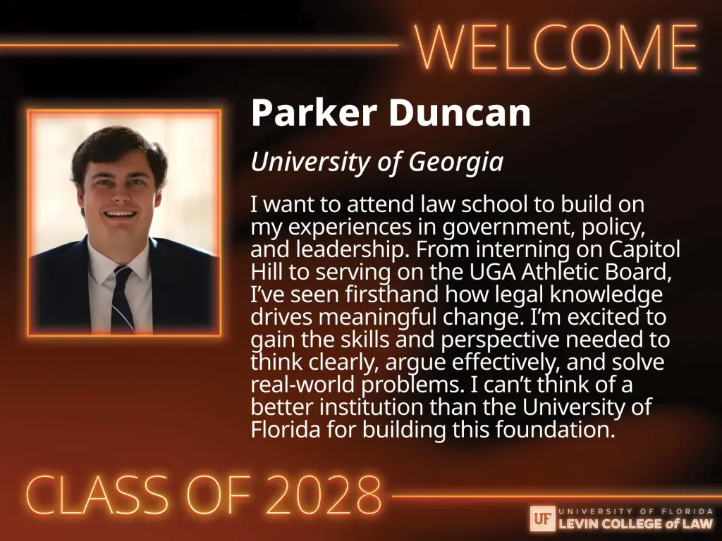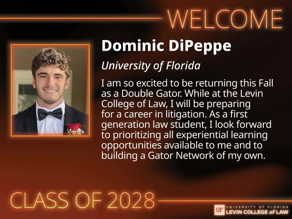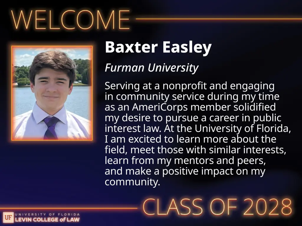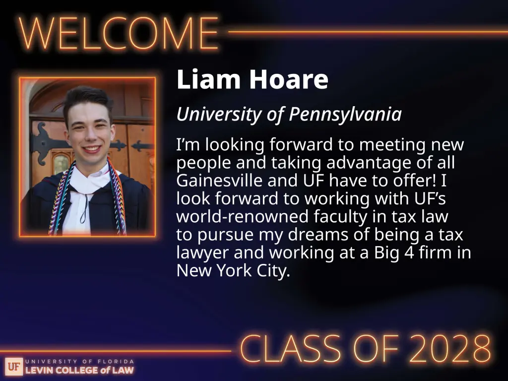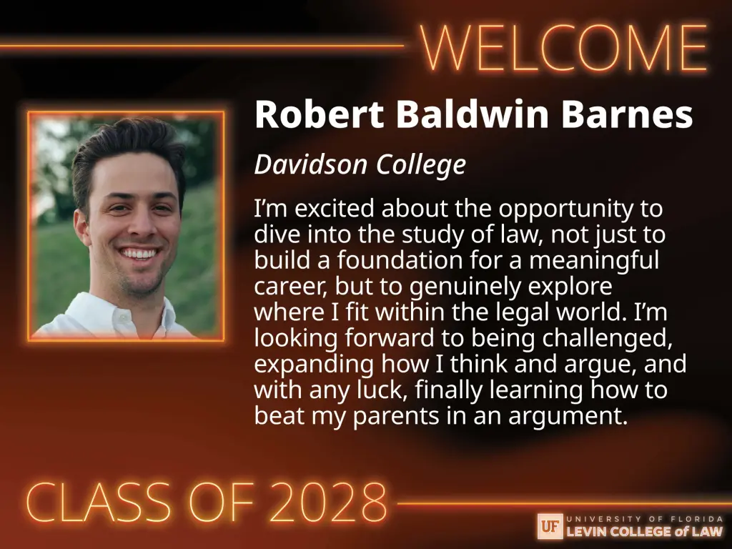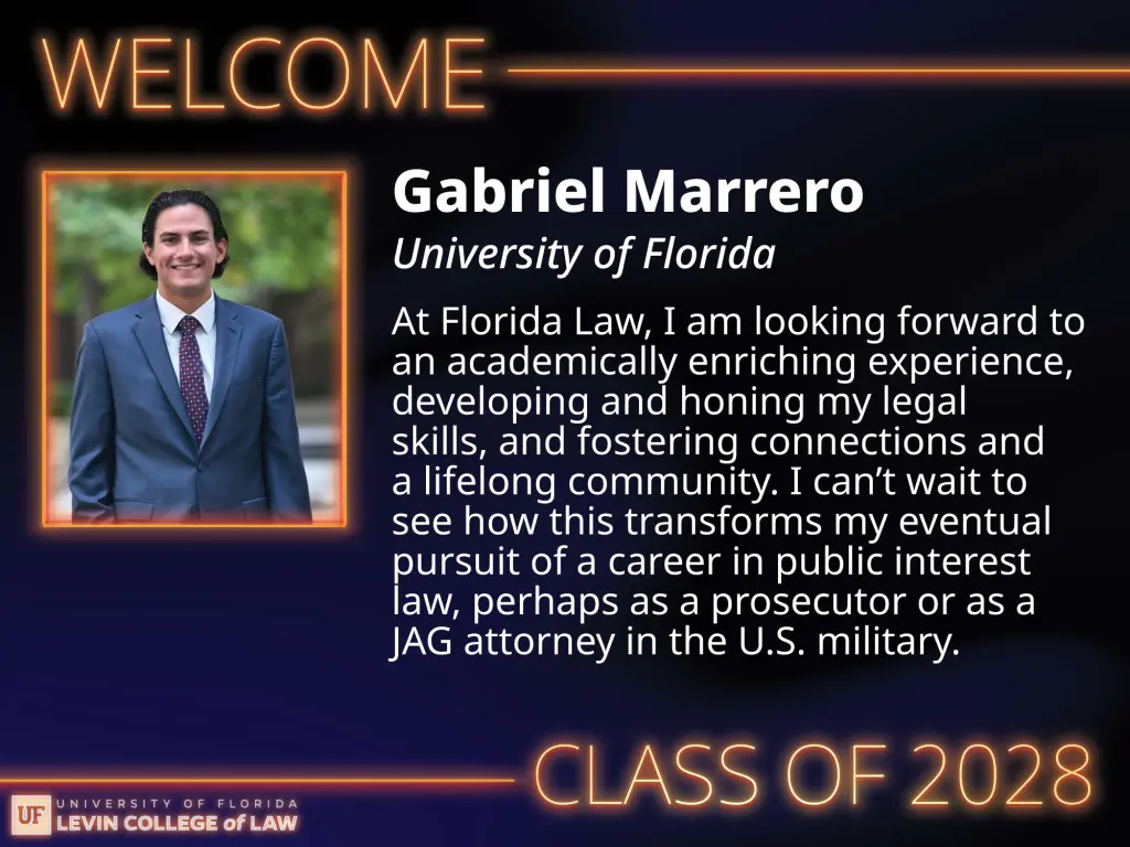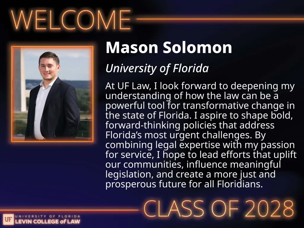 Leslie Green stands behind an oak podium at the front of a lecture hall. She is smiling and wearing a black suit blazer with a white shirt. Behind her is oak paneling toward the floor, and then a row of giant white boards. To her right is a long table with a black tablecloth over it. There are no one in the seats and on top of the black table cloth is a smaller blue table cloth with the UF Levin College of Law logo. In the foreground, students face the front as they listen to Leslie speak. They are slightly blurred. The focus is on Leslie, who is speaking.