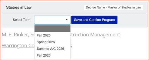 - Select “Studies in law Degree Name – Master of Studies in Law”